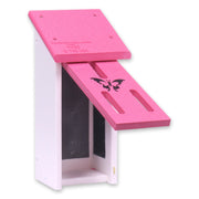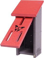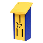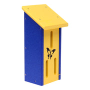 Invite colorful butterflies to enjoy the comforts of this cute butterfly house! This unique Amish-made butterfly house is designed to allow the butterflies to hibernate right in your backyard or garden!! Made from 100% recycled material, these butterfly houses are maintenance-free and fade-resistant. These poly lumber Butterfly Houses are made by Amish folks in Shipshewana, Indiana. The dimensions of the butterfly house are 12.5"H x 6"W x 5"D and they can easily be mounted on a post or tree.