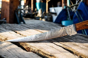 Experience precision and craftsmanship with this custom handmade Damascus fillet knife. Designed for effortless filleting, its 8-inch Damascus steel blade offers exceptional sharpness and durability. The 13-inch overall length provides optimal balance, while the camel bone and rosewood handle ensures a comfortable grip. Whether for fishing or kitchen use, this knife is built for precision and style.