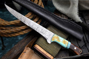 Experience precision cutting with this custom handmade fillet knife crafted from high-quality Damascus steel. Designed for anglers and chefs alike, this knife features a 7.8-inch razor-sharp blade, ensuring effortless filleting of fish. The ergonomic rosewood and resin handle offers a secure grip for ultimate control. Comes with a leather sheath for safe storage.