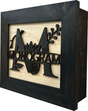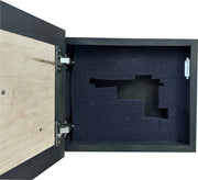 This hidden gun safe with a decorative customized monogrammed front with Your Last Name is a secure in wall or on wall gun safe complete with a magnetic lock and a customizable foam insert that is easily modified to fit your gun and other tactical self defense gear. The decorative wall gun case is finished in black stain with a natural maple front and 3D cutout monogram. Our advanced design ensures your gun is safely and securely stored yet quickly accessible when the key is applied. Best of all - No one will ever know what's inside!