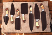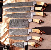 Upgrade your culinary experience with this custom handmade kitchen knives set, crafted from high-quality Damascus steel for superior sharpness and durability. The set includes knives ranging from 13 to 8 inches in length, featuring exquisite bone and exotic wood handles with steel bolsters for a comfortable grip and elegant finish. Each knife is carefully hand-forged, making it a perfect blend of function and artistry. Comes with a premium leather roll for safe storage and easy carrying.
