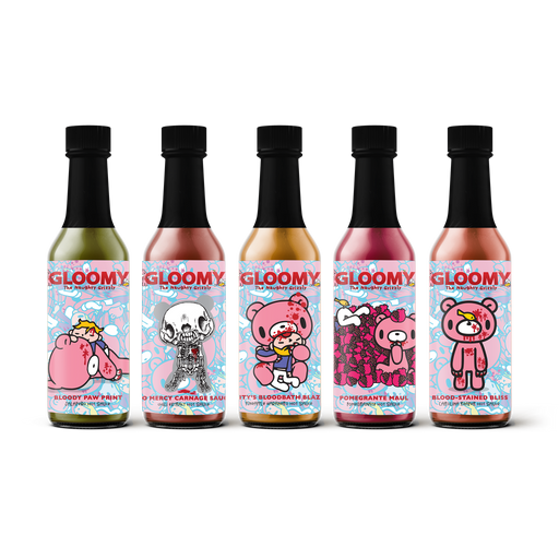 This Hot Sauce Pack contains all 5 Gloomy Hot Sauce Flavors! No Mercy Carnage Sauce : Chili Extract Hot SaucePomegranate Maul : Pomegranate Hot Sau...