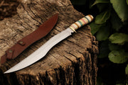 Elevate your collection with this exquisite custom handmade Bowie knife. Featuring a rugged 12-inch D2 steel blade, this knife is built for durability and precision. The handle is a stunning combination of exotic wood and bone, complemented by a sturdy steel guard for added protection. With an overall length of 17 inches, this Bowie knife is both functional and visually striking. It comes complete with a premium leather sheath, making it easy to carry and store. Whether you're a collector or an outdoor adventurer, this Bowie knife is a timeless piece you'll treasure for years.