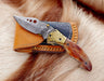 This custom handmade pocket knife features a 3-inch Damascus steel blade that combines sharpness with stunning design. The colored bone handle is complemented by an engraved brass bolster, adding elegance and durability. Equipped with a reliable liner lock mechanism for safety, this knife includes a premium leather case for easy storage and portability.