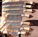 Upgrade your culinary experience with this custom handmade kitchen knives set, crafted from high-quality Damascus steel for superior sharpness and durability. The set includes knives ranging from 13 to 8 inches in length, featuring exquisite bone and exotic wood handles with steel bolsters for a comfortable grip and elegant finish. Each knife is carefully hand-forged, making it a perfect blend of function and artistry. Comes with a premium leather roll for safe storage and easy carrying.