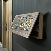 Securely store your gun and other home self defense gear inside the Bellewood Designs Large Hidden Gun Storage Cabinet Deer Scene Wall Decor - Deer In The Woods. Your firearm and other tactical gear is easily accessible yet securely stored, so you'll never have to worry about leaving it unattended. Once you apply the key the lock immediately disengages and you're ready for self defense. This cabinet features a beautiful deep brown frame, natural maple background and eye-catching black 3D deer in the woods scene. The cabinet will be a focal point of any room and no one will ever know what's inside!