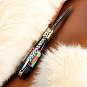 This custom handmade pocket knife features a 3-inch Damascus steel blade, known for its sharpness and unique pattern. The handle combines epoxy resin and buffalo horn, complemented by a durable brass bolster for a stylish yet functional design. Equipped with a reliable back lock mechanism, this pocket knife ensures secure use. Perfect for daily carry, it comes with a leather case for safe storage and easy portability.
