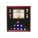 This is our finest quality case, brought to you at a discounted price. Why display your family heirlooms in a lesser quality case, when you can enjoy this furniture-grade flag and document case for less money than would be spent on the cheap imitations. This case is the same as our Premium USA-Made Solid wood Flag And Document Case, but the wood has been finished with a rich cherry stain.